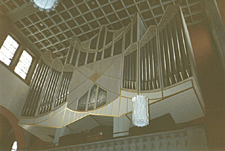 Brustwerk: Liebl. Gedackt 16' Gedackt 8' Quintade 8' Holzflöte 8' Salicional 8' Prinzipal 4' (Prosp.) Gemshorn 4' Flöte 4' Salicional 4' Prinzipal 2' Blockflöte 2' Quinte 1 1/3' (ab G) Sesquialtera 2f. Zimbel 2f. 1/2' Rauschwerk 4f. 1 Bombarde 16' Helle Trompete 8' Oboe 8' Tremulant |