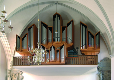 Rückpositiv (Manual I): Gedackt 8' Prinzipal 4' Blockflöte 4' Gemshorn 2' Sesquialtera 2f. Oktave 1' Scharff 4fach Rankett 16' Krummhorn 8' Tremulant |