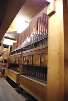 OrgelinneresWeitere Fotos: Mobiler Spieltisch Rückfront der Bühne mit „Prospekt“ (links die Rückseite des Spieltisches) |